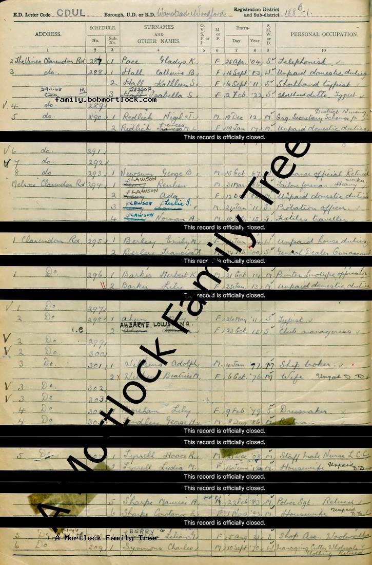 | Census | 29 September 1939 (Age 56) South Woodford, Essex, England Address: 5 Clarendon Road
