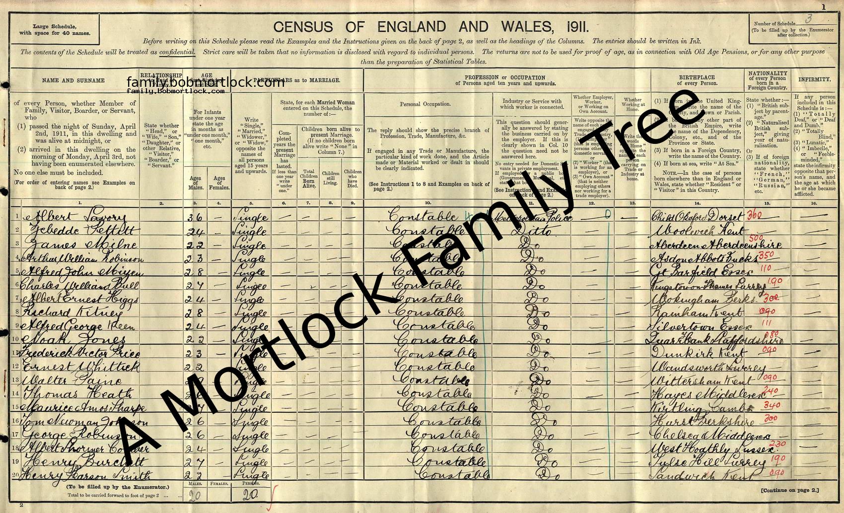 | Census | 2 April 1911 (Age 28) Shadwell, E London, England Address: Police Station, King David Lane