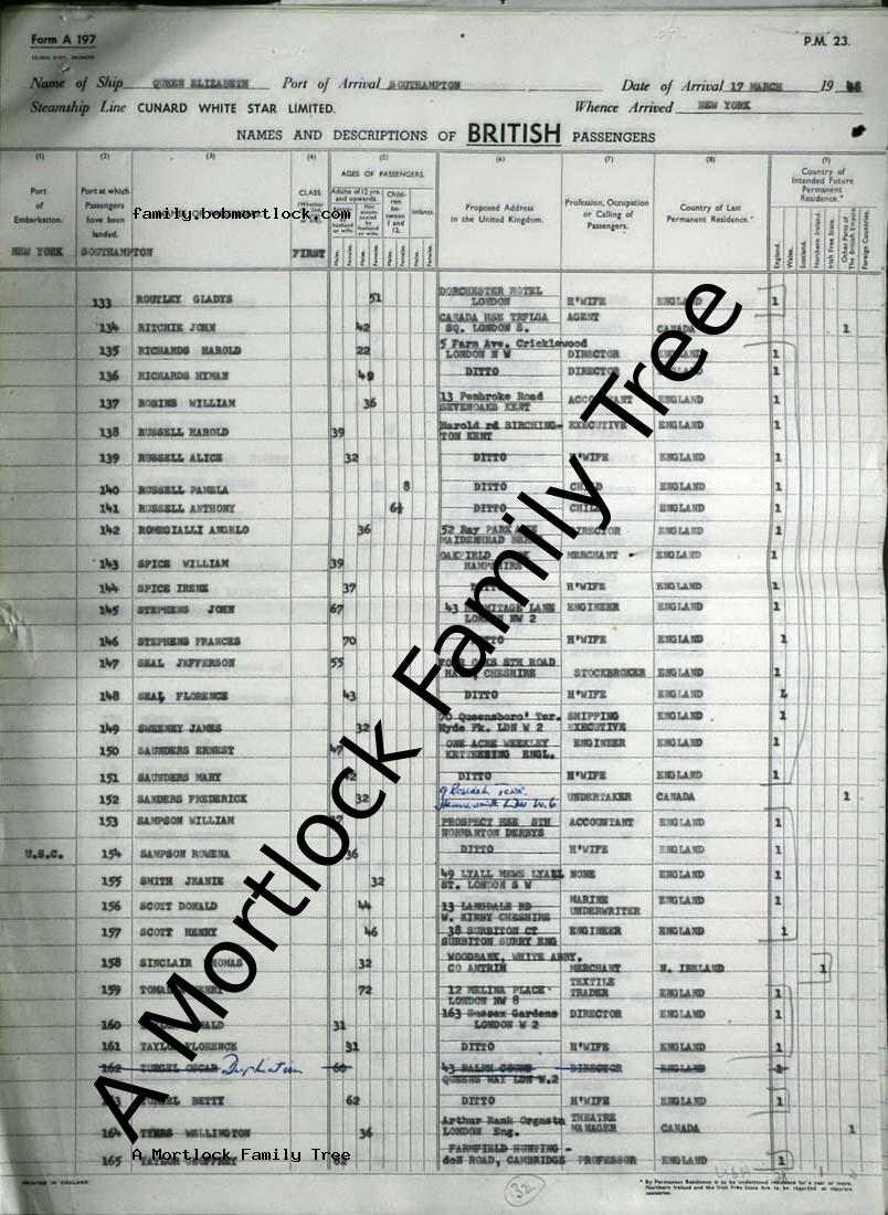| Travel - Arrival | 17 March 1948 (Age 35) Southampton, Hampshire, England Agency: Cunard White Star Ltd |