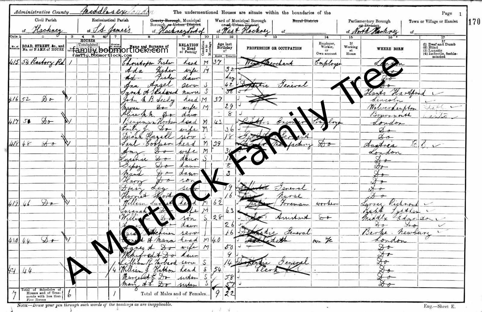 | Census | 31 March 1901 (Age 44) Hackney, E London, England Address: 50 Rectory Road