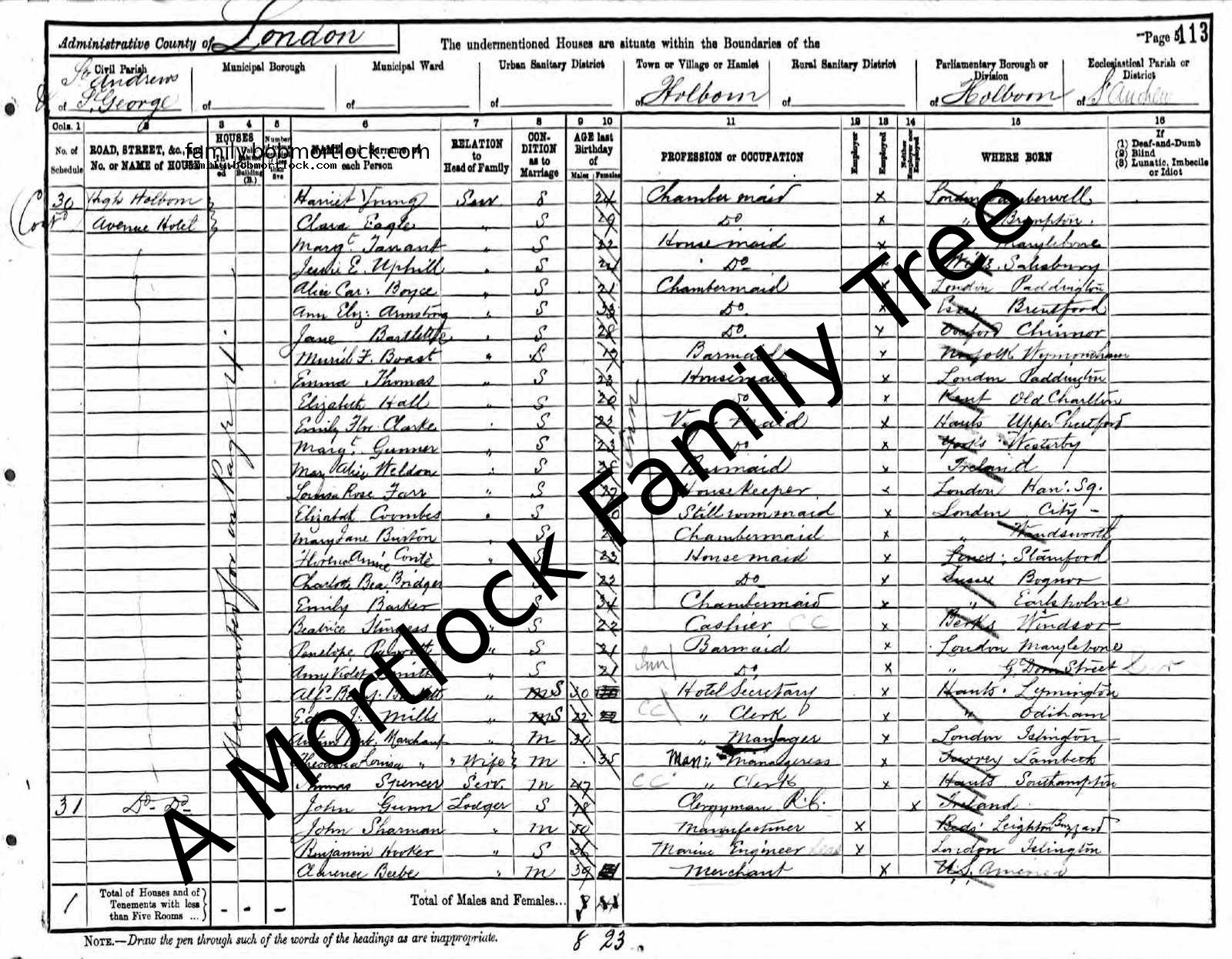 | Census | 5 April 1891 (Age 34) Holborn, C London, England Address: Avenue Hotel, High Holborn