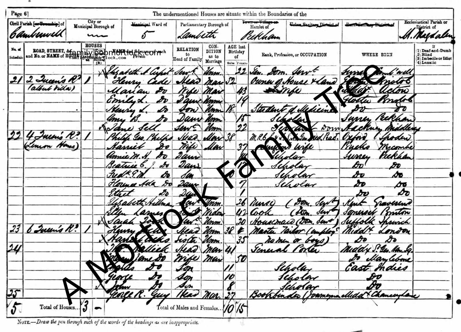 | Census | 3 April 1881 (Age 20) Camberwell, S London, England Address: Talbert, 2 Queens Road