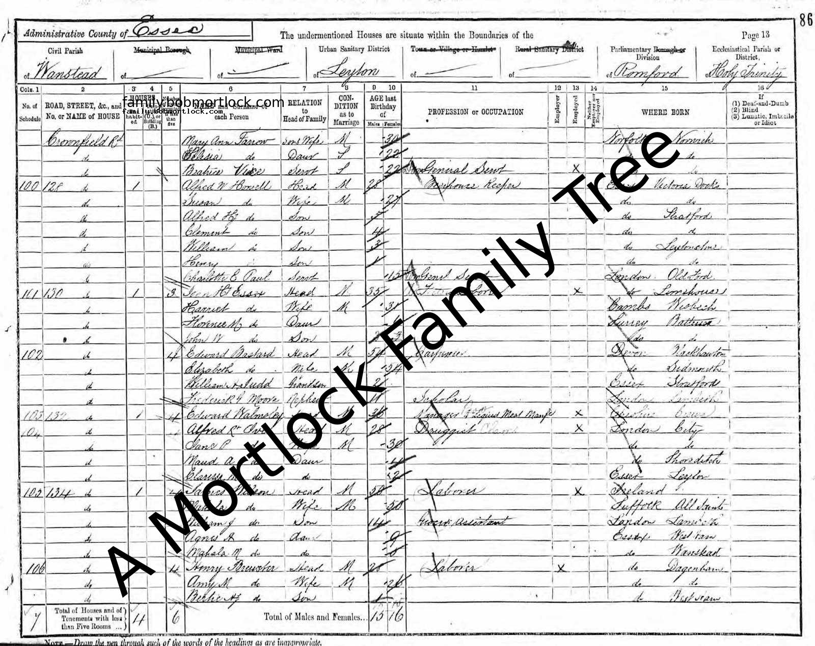 | Census | 5 April 1891 (Age 30) Wanstead, Essex, England Address: 132 Crownfield Road