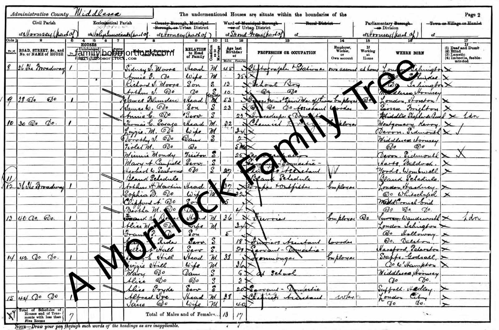 | Census | 31 March 1901 (Age 40) Hornsey, Middlesex, England Address: 44 The Broadway