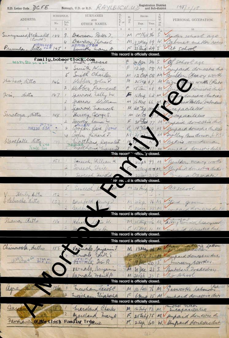 | Census | 29 September 1939 (Age 79) Rayleigh, Essex, England Address: Fairhaven, Helena Road