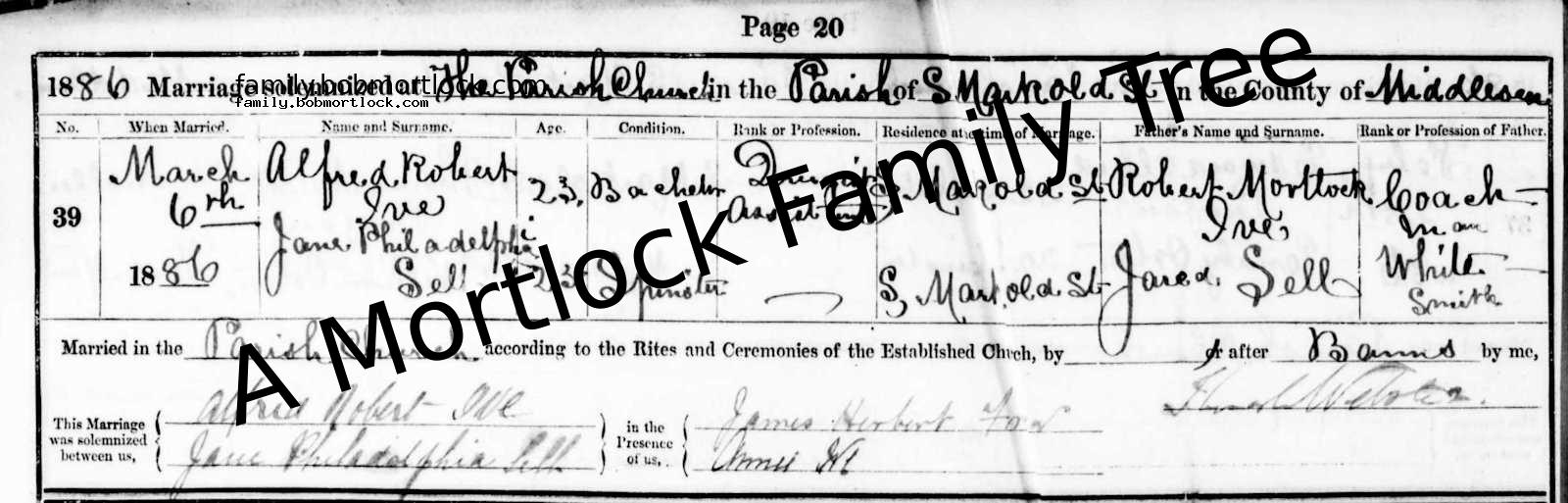 | Religious Marriage | Alfred Robert IVE - View family 6 March 1886 (Age 25) Shoreditch, E London, England Address: The Parish Church, St Mark |