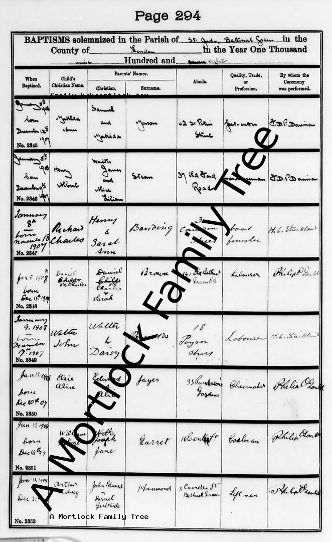 | Baptism | 8 January 1908 (Age 51 days) Bethnal Green, E London, England Address: St Jude |