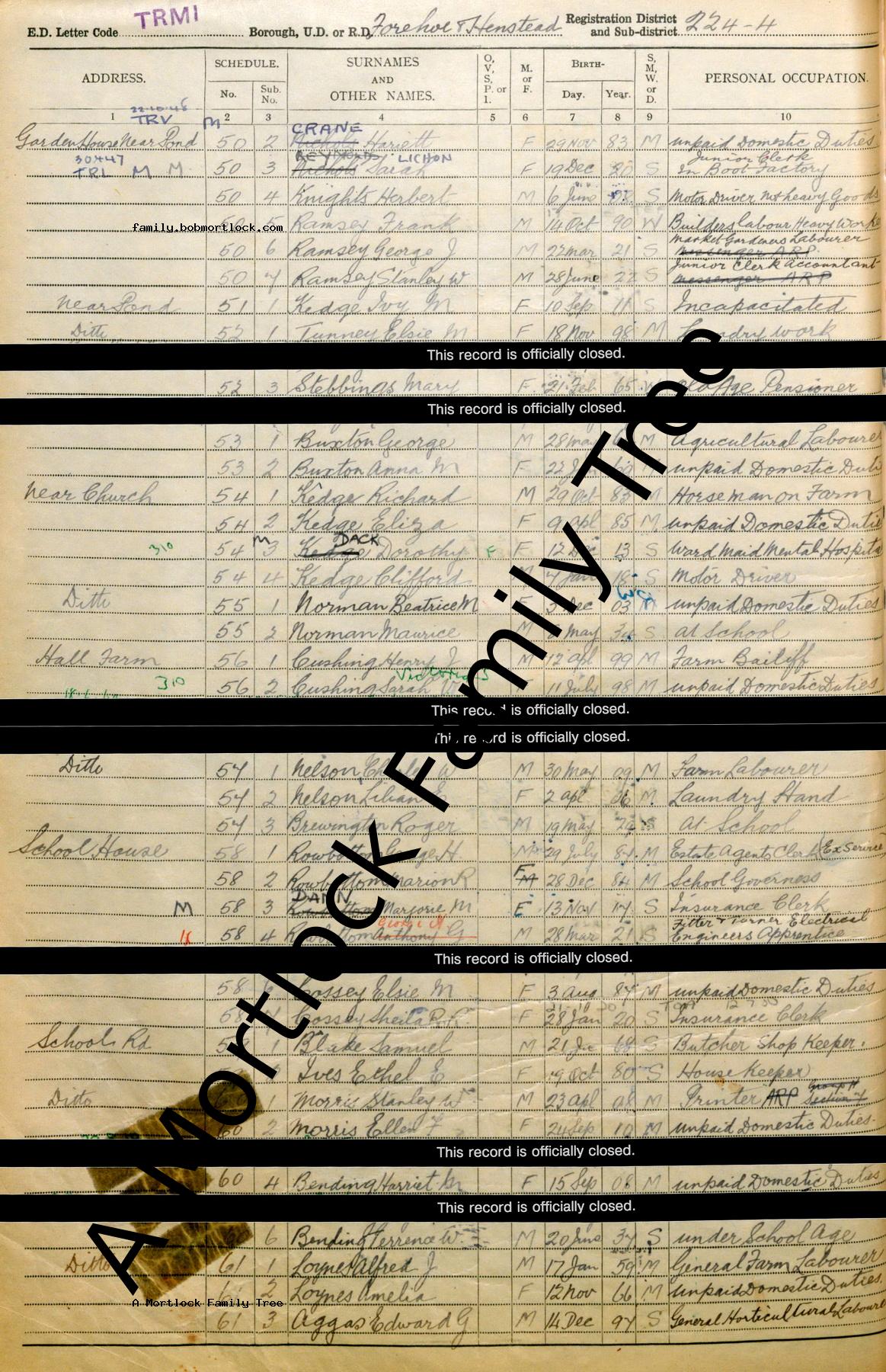 | Census | 29 September 1939 (Age 31) Forehoe & Henstead, Norfolk, England Address: School Road