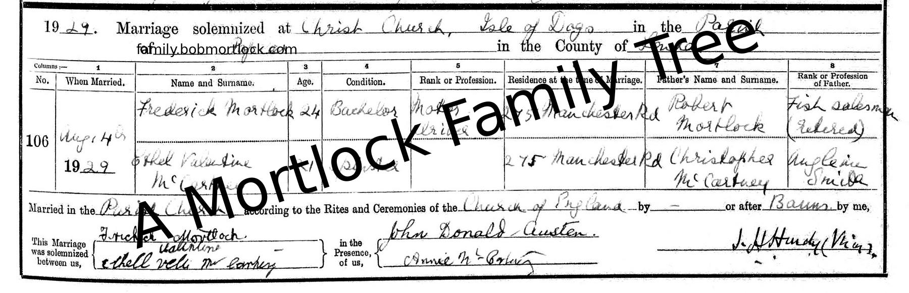 | Religious Marriage | Frederick Frank MORTLOCK - View family 4 August 1929 (Age 21) Poplar, E London, England |