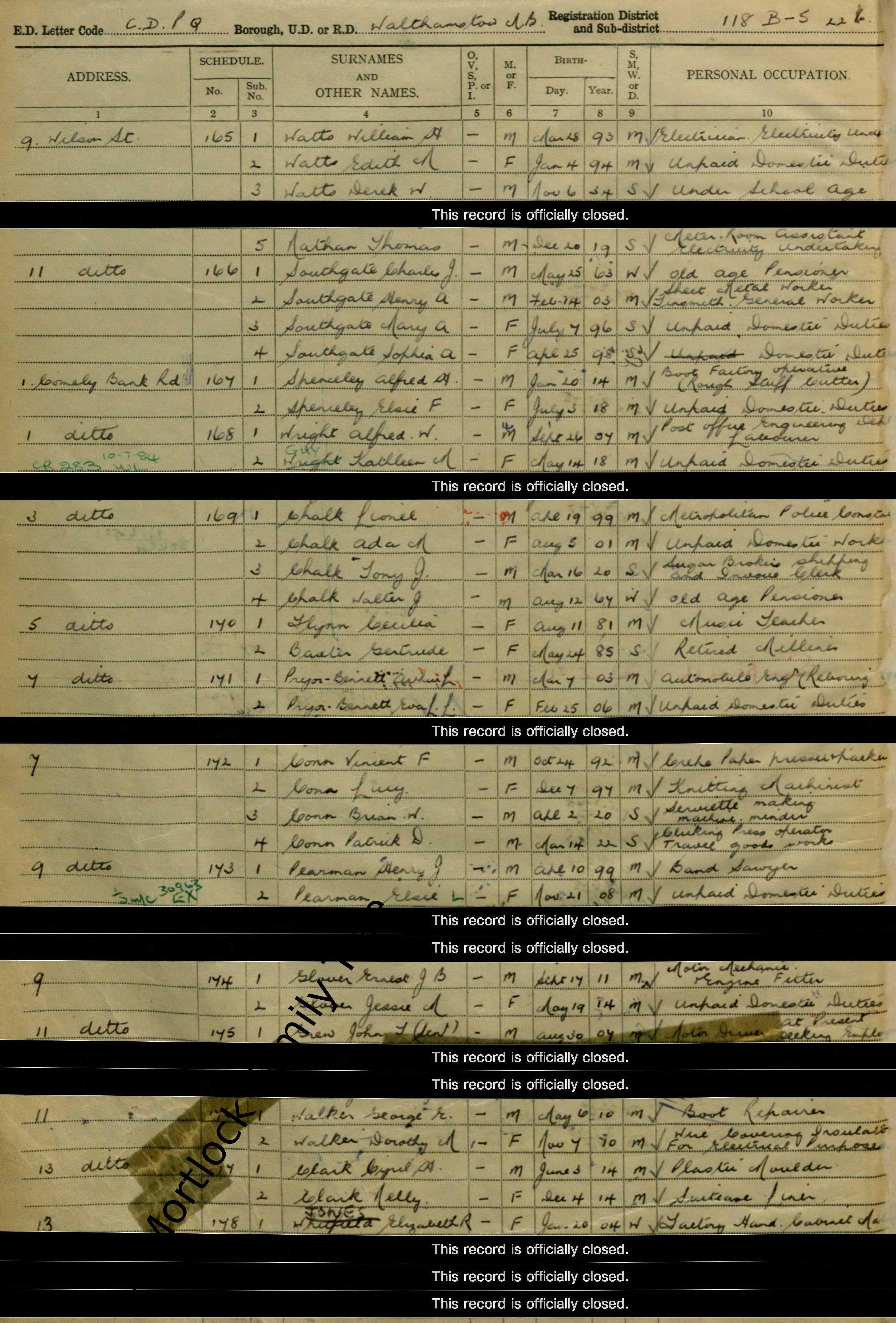 | Census | 29 September 1939 (Age 19) Wanstead, Essex, England Address: 7 Comely Bank Road