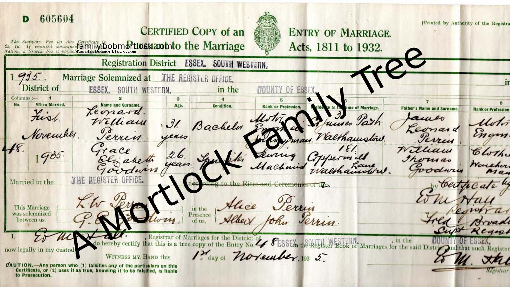 | Civil Marriage | Grace Elizabeth GOODWIN - View family 1 November 1935 (Age 31) Walthamstow, Essex, England Address: The Register Office
