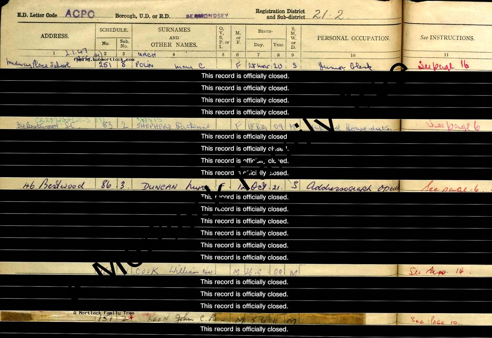 | Census | 29 September 1939 (Age 28) Bermondsey, S London, England Address: 29 Bush Road