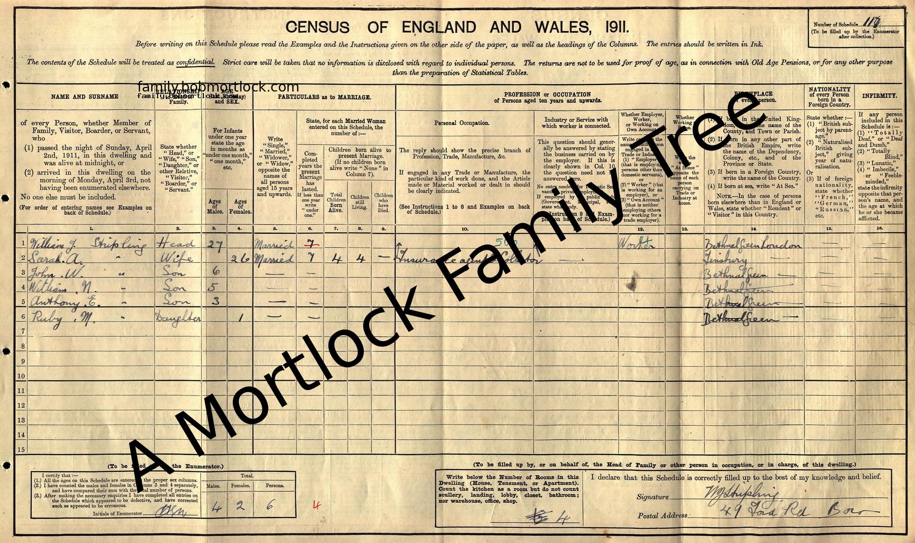 | Census | 2 April 1911 (Age 26) Poplar, E London, England Address: 49 Ford Road, Old Ford, Bow