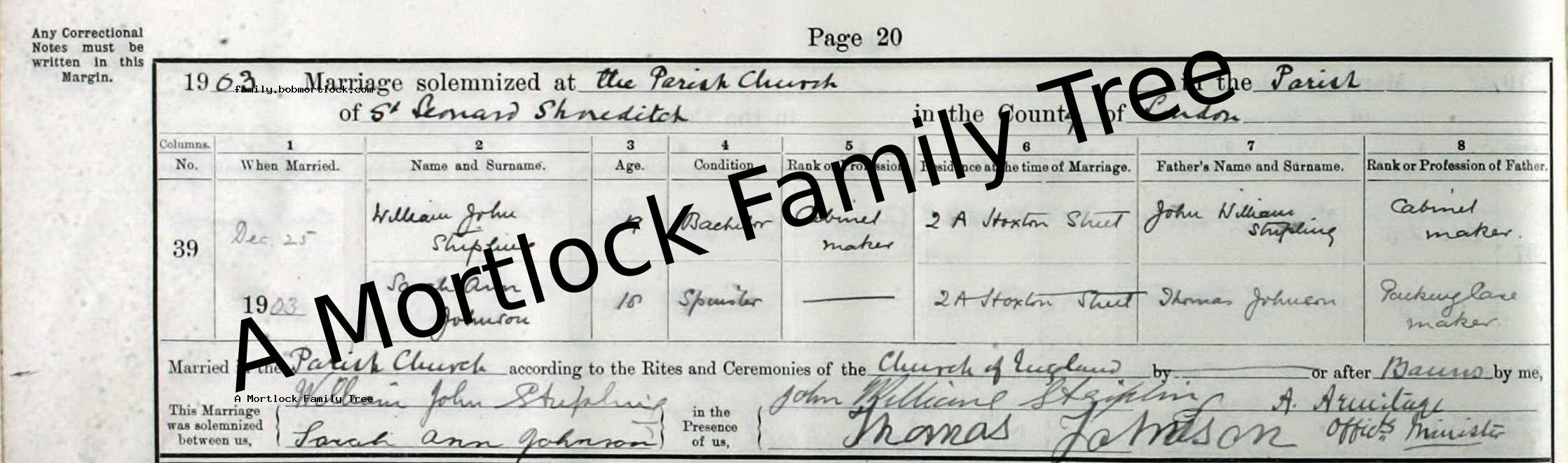 | Religious Marriage | William John STRIPLING - View family 25 December 1903 (Age 18) Shoreditch, E London, England Address: Saint Leonard |