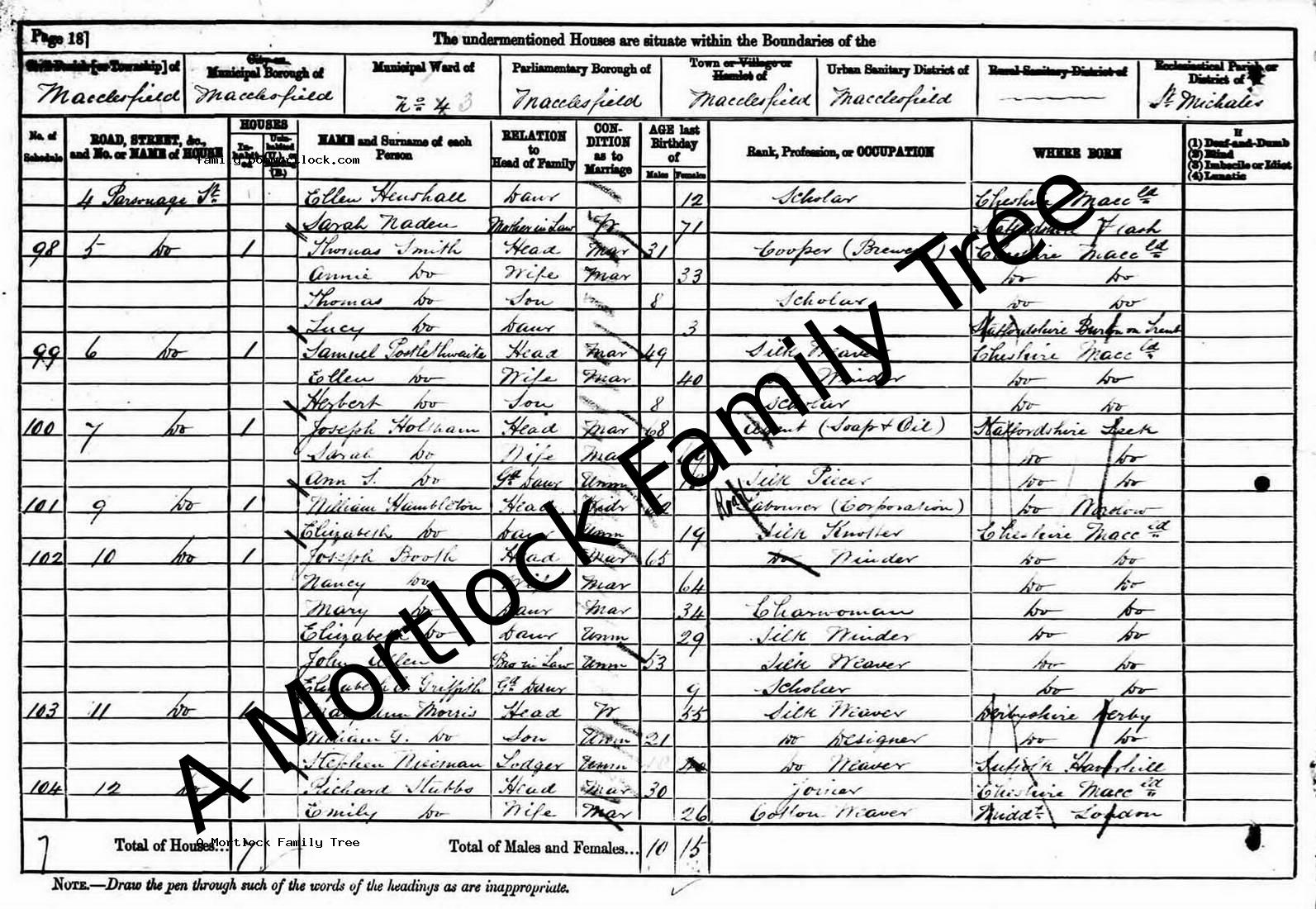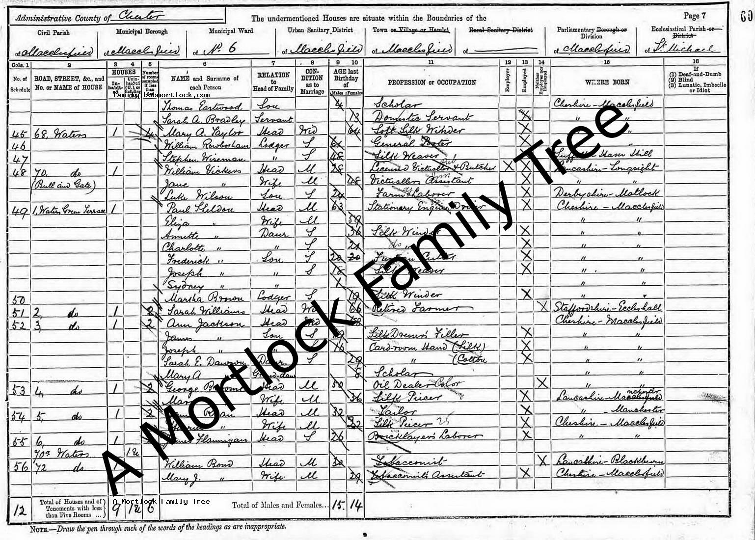 | Census | 5 April 1891 (Age 51) Macclesfield, Cheshire, England Address: 68 Waters