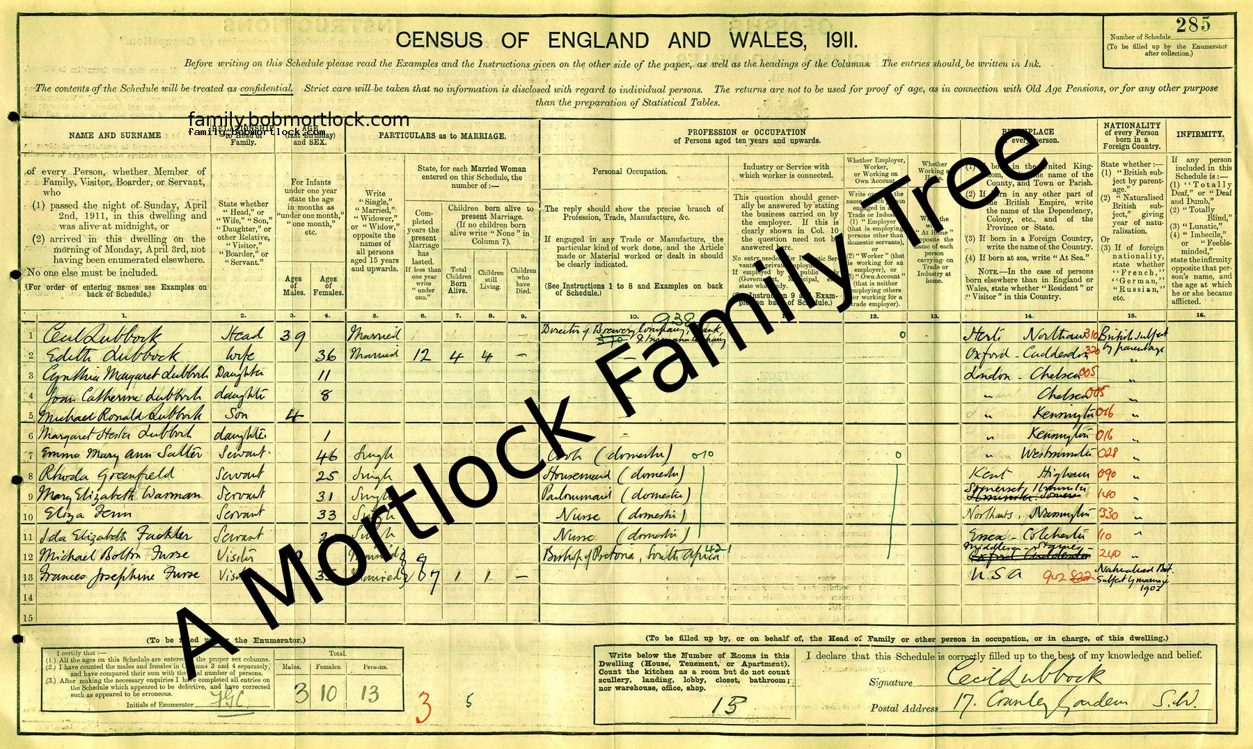| Census | 2 April 1911 (Age 34) Kensington and Chelsea, W London, England Address: 17 Cranley Gardens, South Kensington