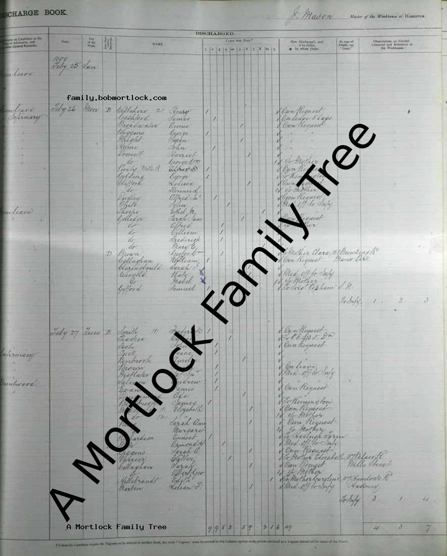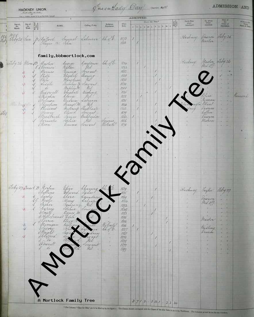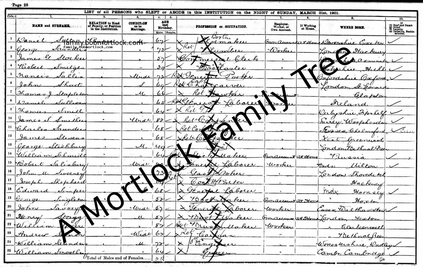 | Census | 31 March 1901 (Age 62) Hackney, E London, England Address: Hackney Union Workhouse