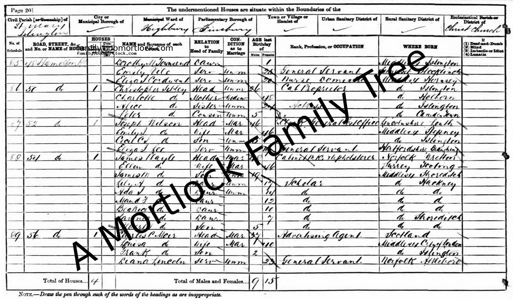 | Census | 3 April 1881 (Age 55) Islington, N London, England Address: 50 Hamilton Road