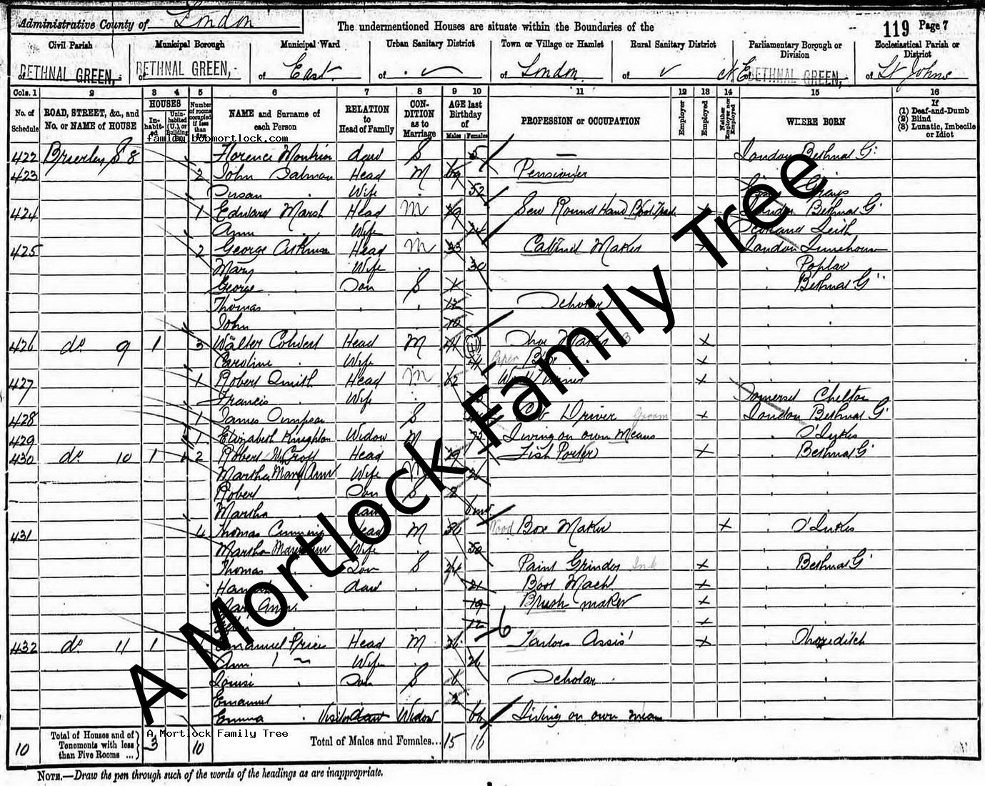 | Census | 3 April 1881 (Age 59) Bethnal Green, E London, England Address: 8 Brierley Street