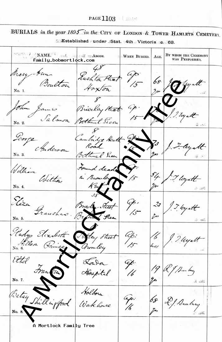 | Death | 1895 (Age 73) Bethnal Green, E London, England Address: 8 Brierley Street |