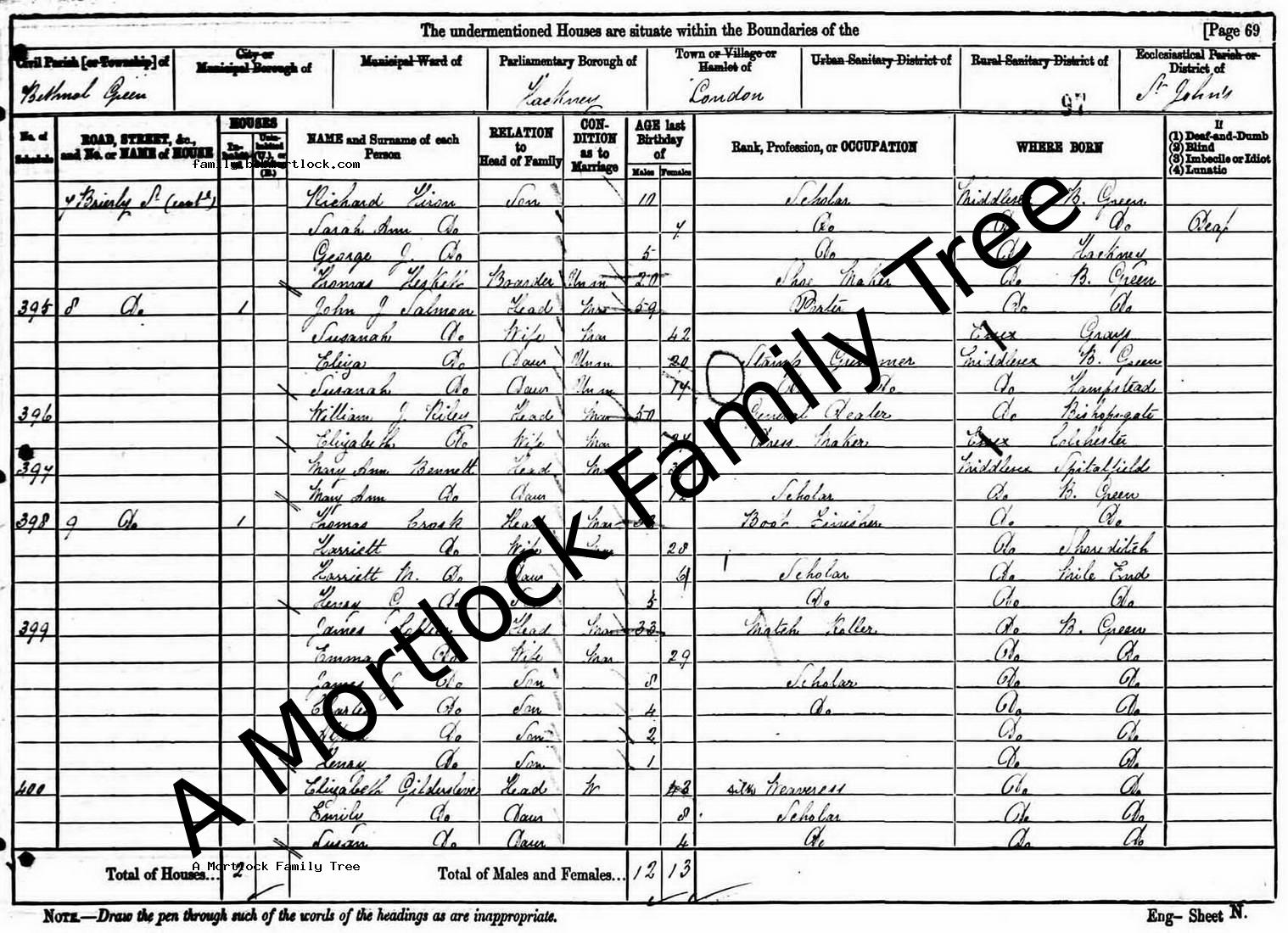 | Census | 5 April 1891 (Age 69) Bethnal Green, E London, England Address: 8 Brierley Street