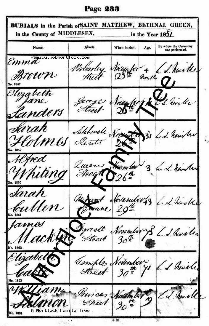 | Burial | 30 November 1851 (Age 19) Bethnal Green, E London, England Address: St Matthew |