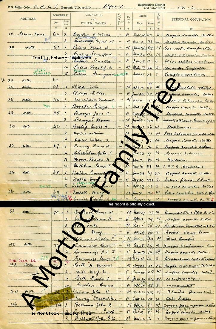 | Census | 29 September 1939 (Age 63) Ilford, Essex, England Address: 38 Green Lane