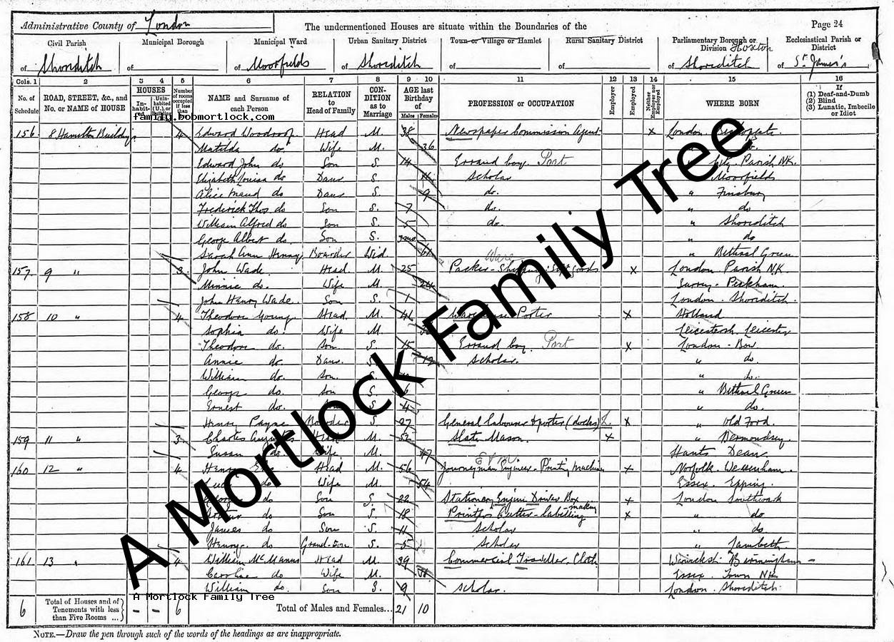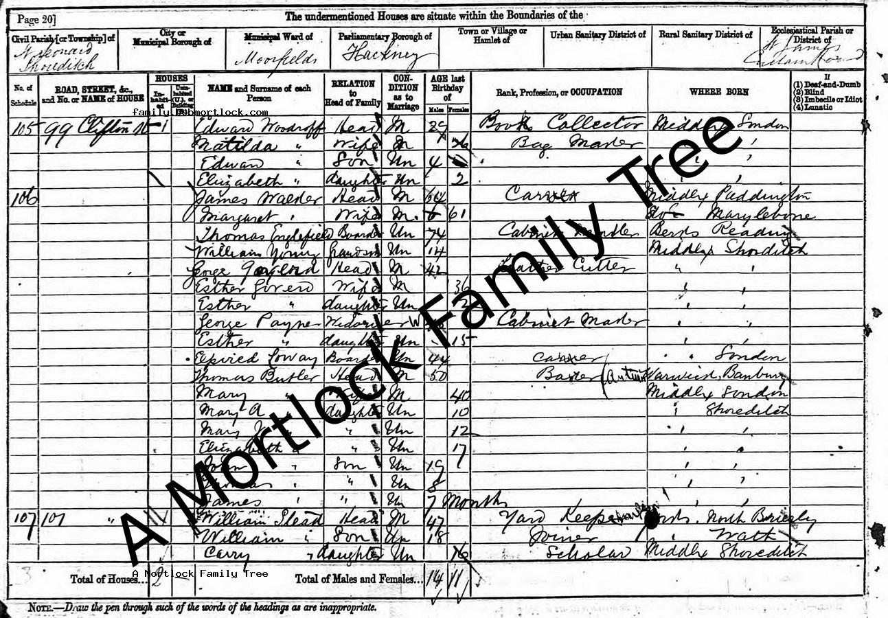 | Census | 5 April 1891 (Age 39) Shoreditch, E London, England Address: 8 Hamilton Buildings