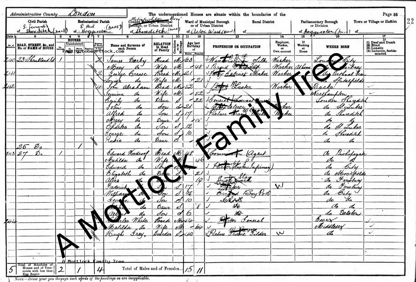 | Census | 31 March 1901 (Age 49) Shoreditch, E London, England Address: 27 Shrubland Road