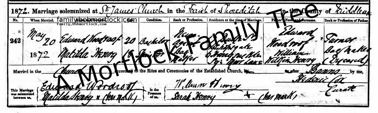 | Religious Marriage | Matilda HENRY - View family 20 May 1872 (Age 20) Shoreditch, E London, England Address: St James