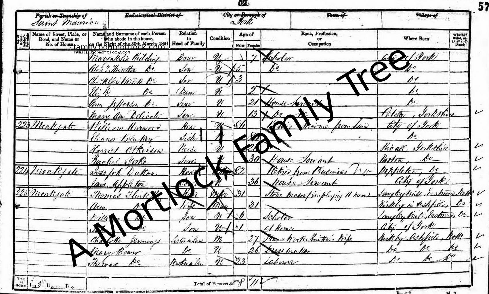| Census | 30 March 1851 (Age 82) York, Yorkshire, England Address: Monkgate