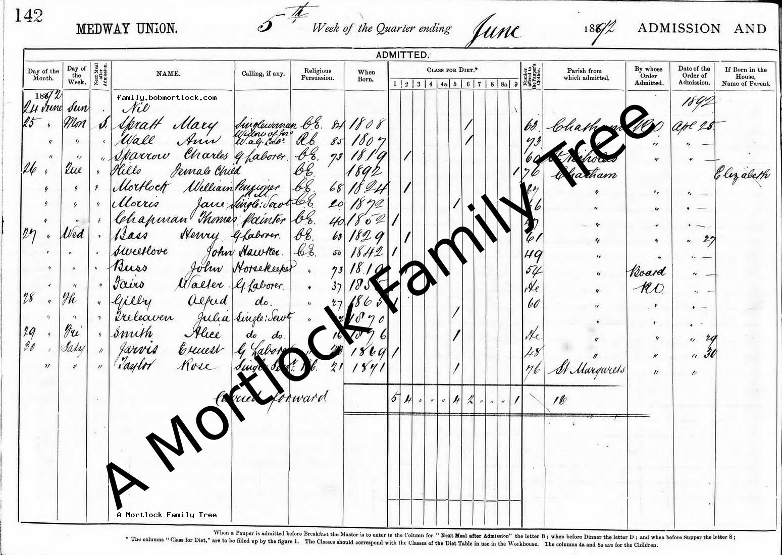 | Residence | 1892 (Age 67) Chatham, Kent, England Address: Medway Union Workhouse |