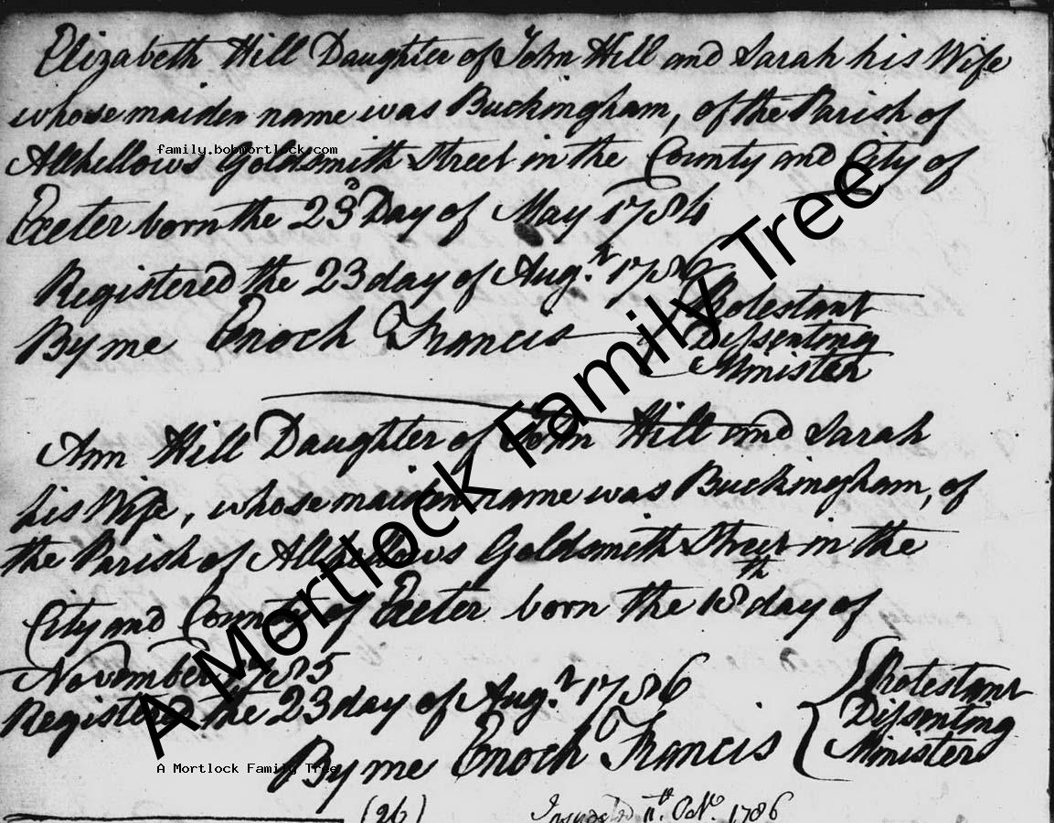 | Baptism | 23 August 1786 (Age 9 months) Exeter, Devon, England Address: All Hallows Baptist, Goldsmith Street |