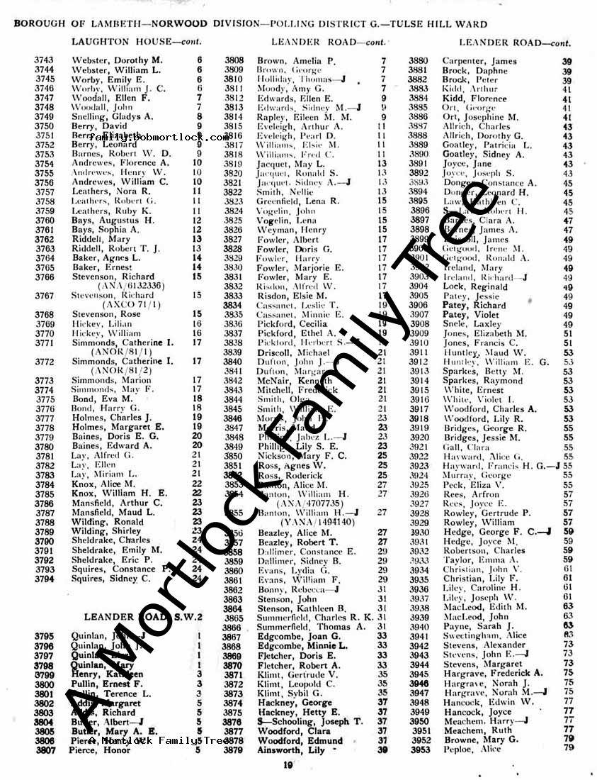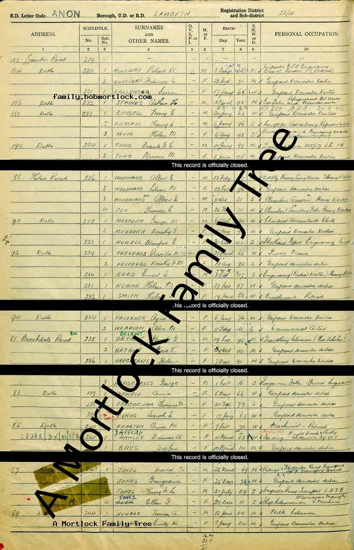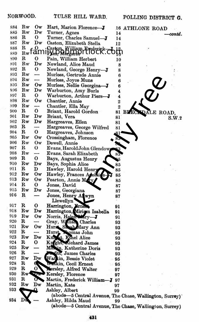 | Electorial Register | 1939 (Age 24) Norwood, Surrey, England Address: 85 Beechdale Road |