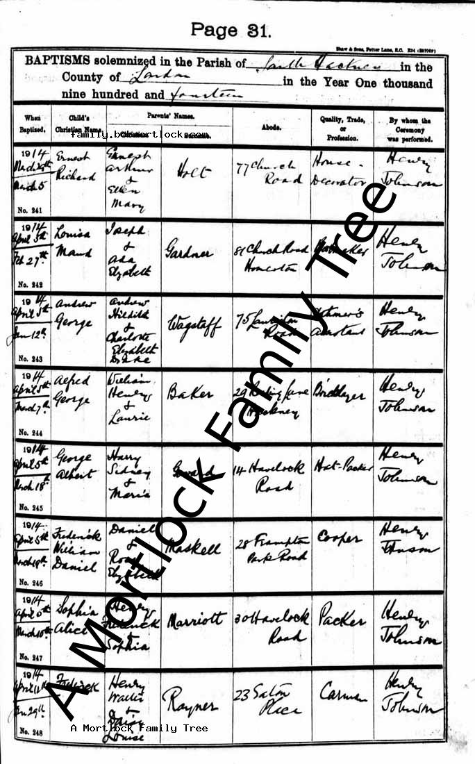| Baptism | 20 April 1914 (Age 41 days) Hackney, E London, England Address: St John |