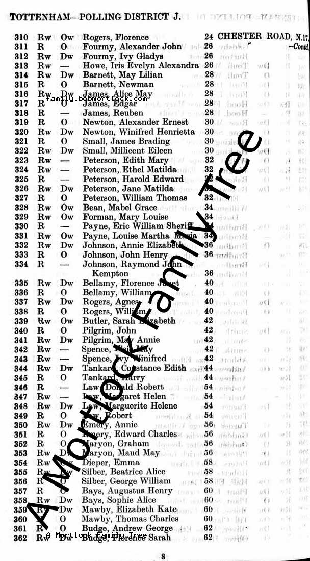 | Electorial Register | 1936 (Age 21) Tottenham, N London, England Address: 60 Chester Road |