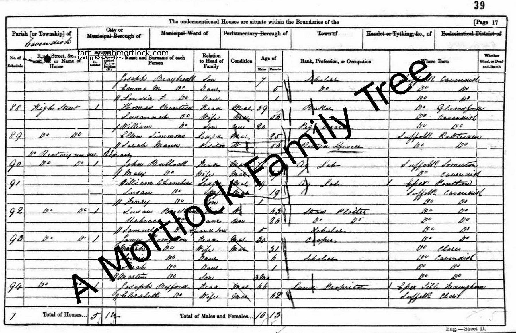 | Census | 6 June 1841 (Age 39) Cavendish, Suffolk, England Address: High Street