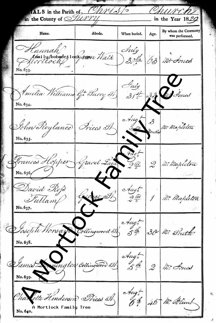 | Residence | 1829 (on the date of death) Southwark, S London, England Address: Green Walk Note: From the Burial Record |