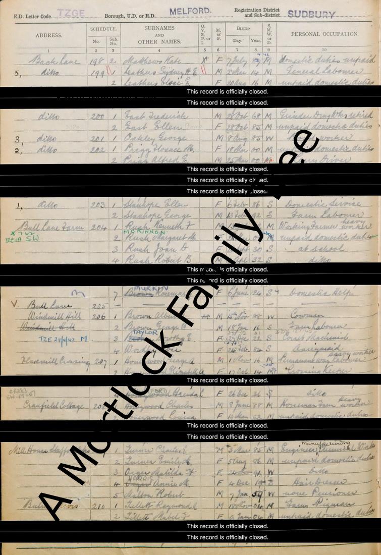 | Census | 29 September 1939 (Age 52) Melford, Suffolk, England Address: Back Lane