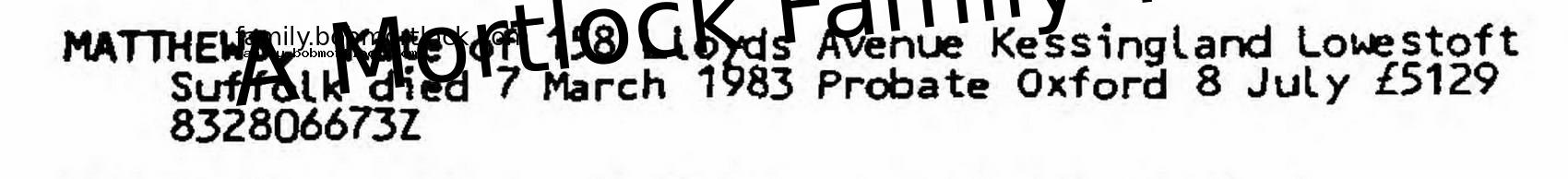| Residence | 7 March 1963 (on the date of death) Lowestoft, Suffolk, England Address: 158 Lloyds Avenus, Kessingland Note: From the Probate Record |