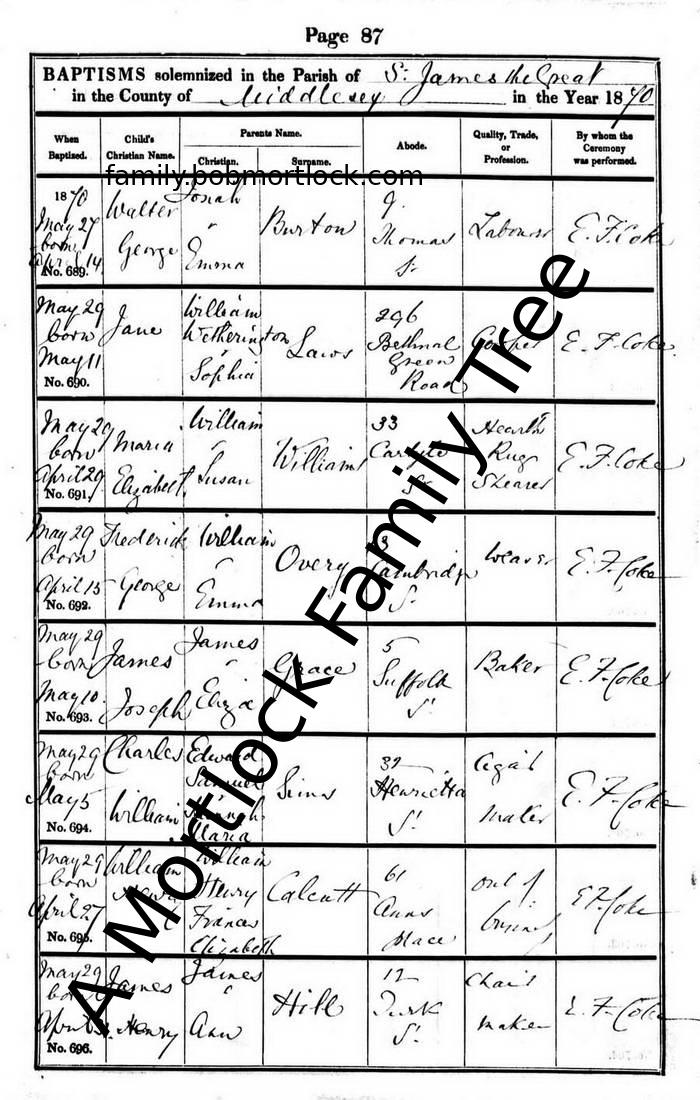| Baptism | 29 May 1870 (Age 30 days) Bethnal Green, E London, England Address: St James the Great |