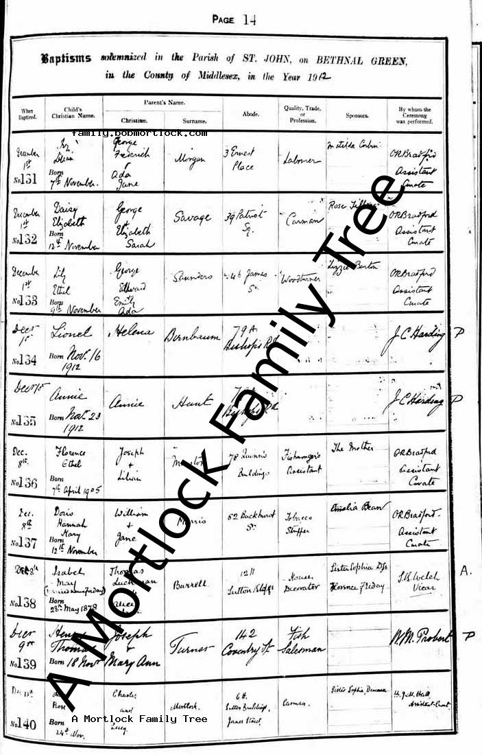 | Baptism | 13 December 1912 (Age 19 days) Bethnal Green, E London, England Address: St John |