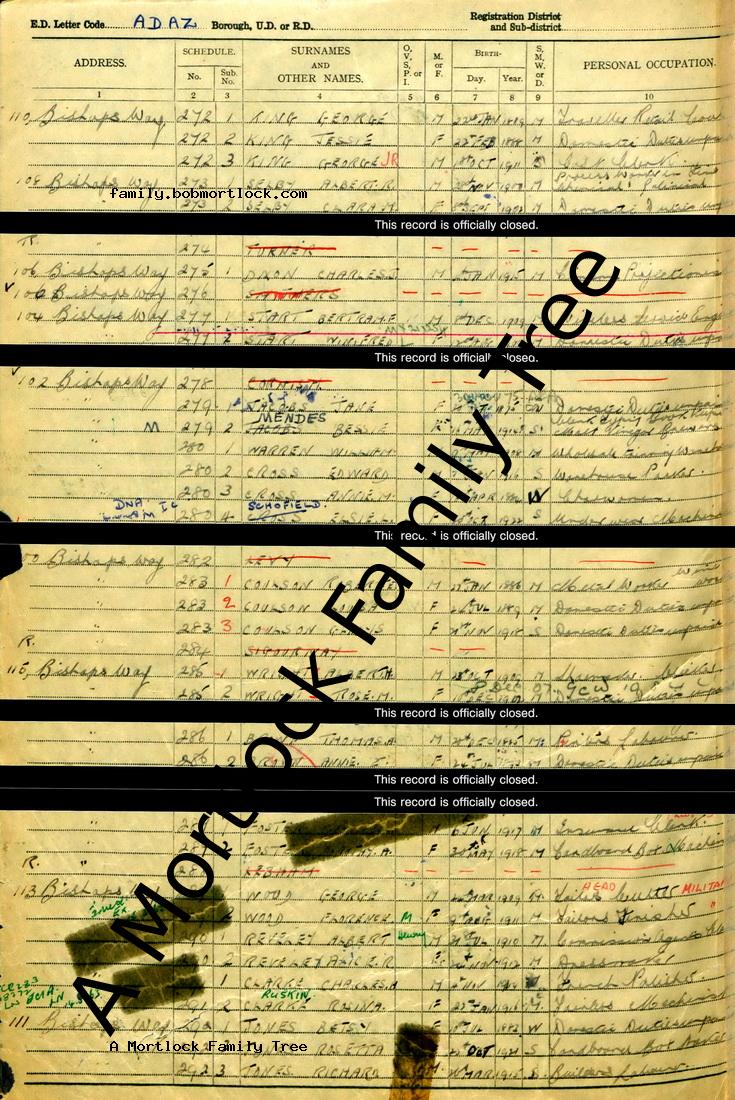 | Census | 29 September 1939 (Age 26) Bethnal Green, E London, England Address: 113 Bishops Way