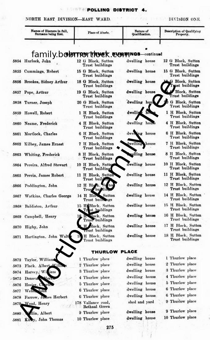 | Residence | 1924 (Age 45) Bethnal Green, E London, England Address: 1 E-Block, Sutton Model Dwellings, James Street |
