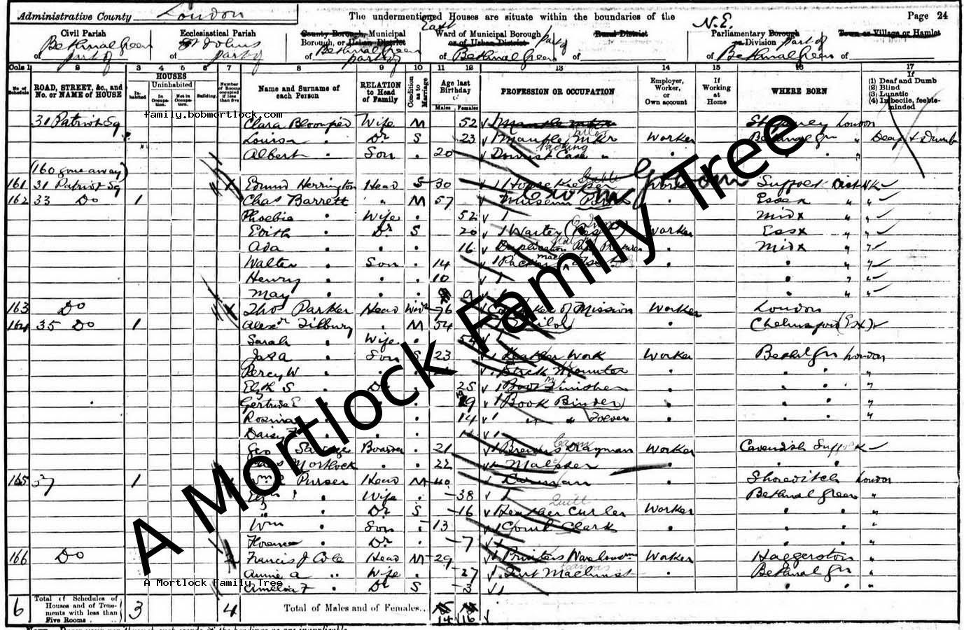 | Census | 31 March 1901 (Age 23) Bethnal Green, E London, England Address: 35 Patriot Square