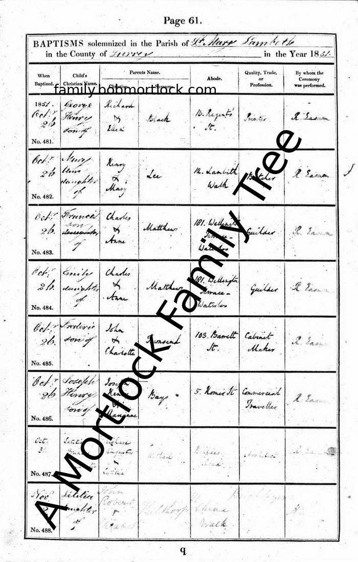 | Baptism | 26 October 1851 (Age 19 days) Lambeth, S London, England Address: St Mary |
