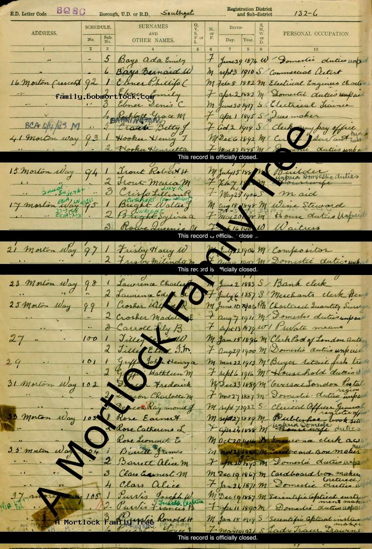 | Census | 29 September 1939 (Age 66) Southgate, Middlesex, England Address: 15 Morton Crescent