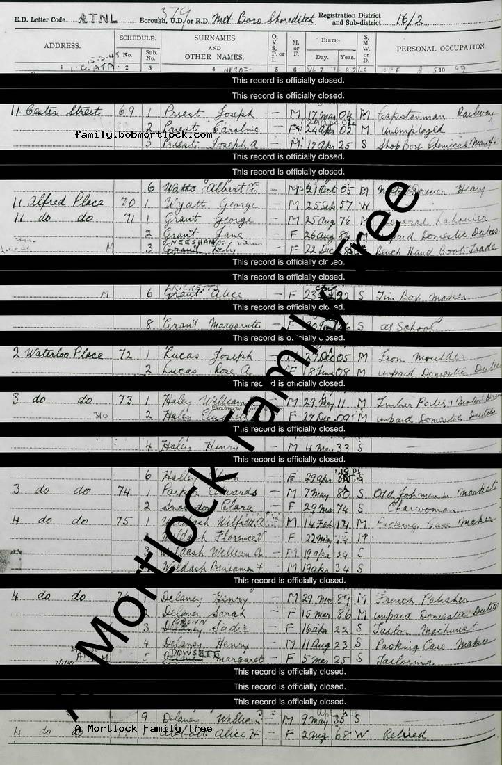 | Census | 29 September 1939 (Age 35) Shoreditch, E London, England Address: 11 Chester Street