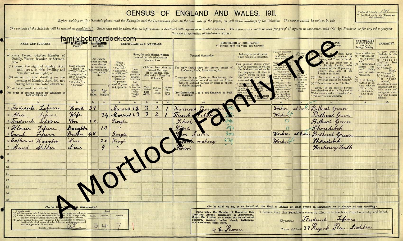 | Census | 2 April 1911 (Age 20) Dalston, E London, England Address: 38 Regents Row