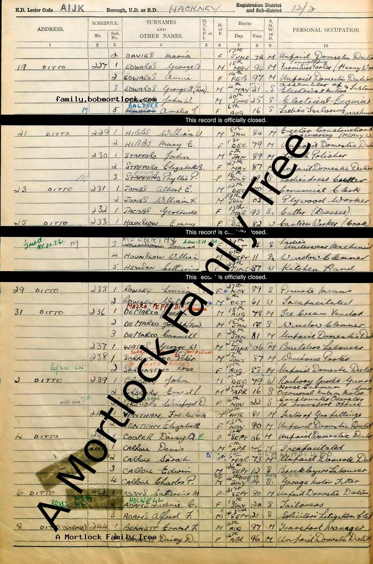 | Census | 29 September 1939 (Age 49) Hackney, E London, England Address: 6 Holly Street